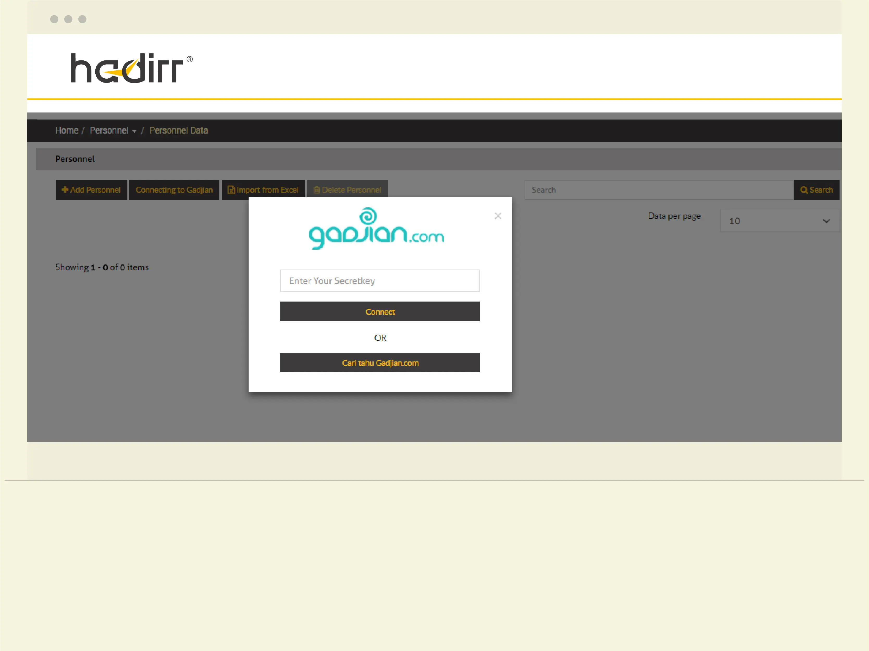 Please login to your Hadirr account, select the Personnel > Personnel Data > Connecting to Gadjian then a pop-up will appear asking you to enter secret-key.
