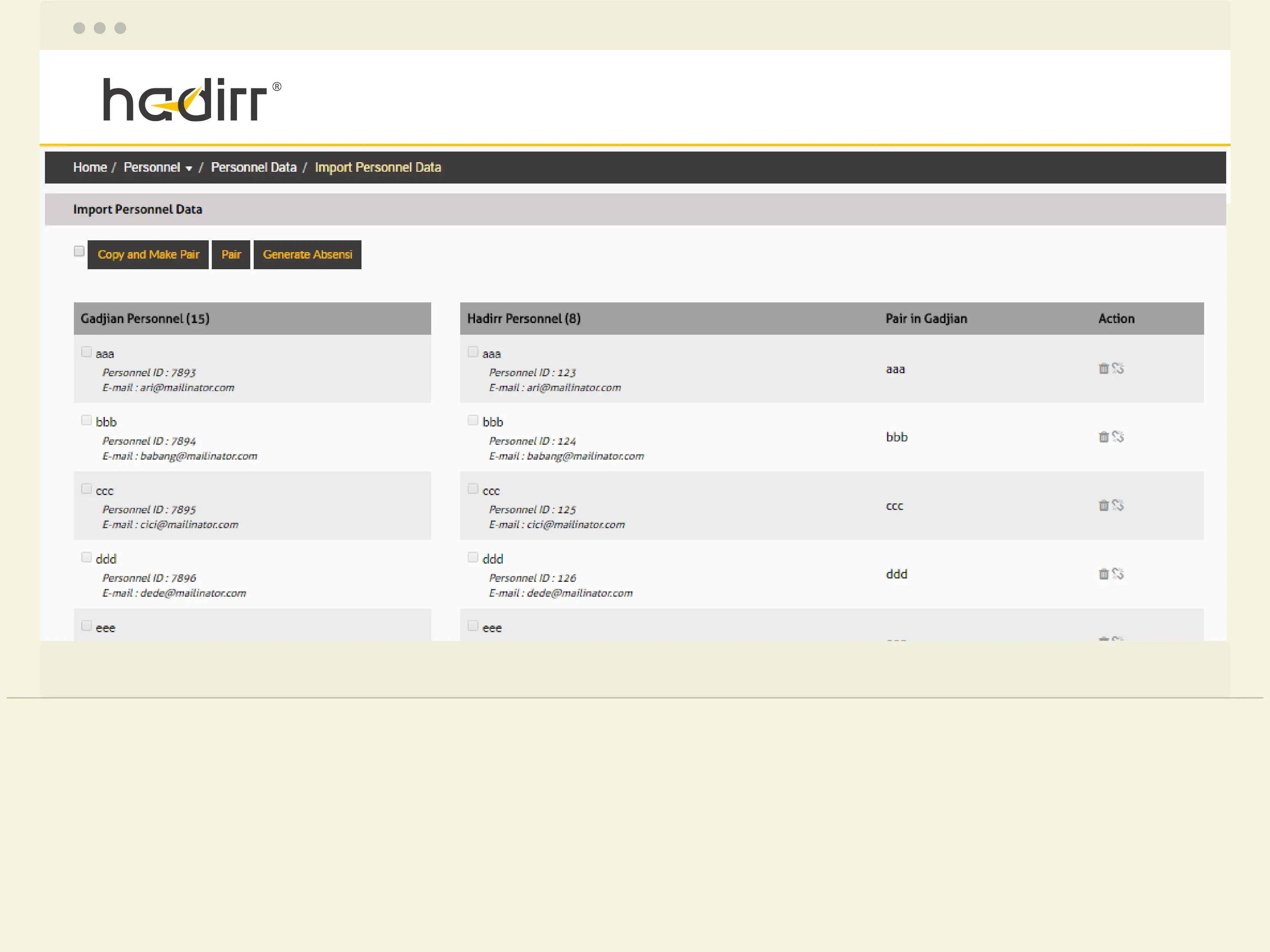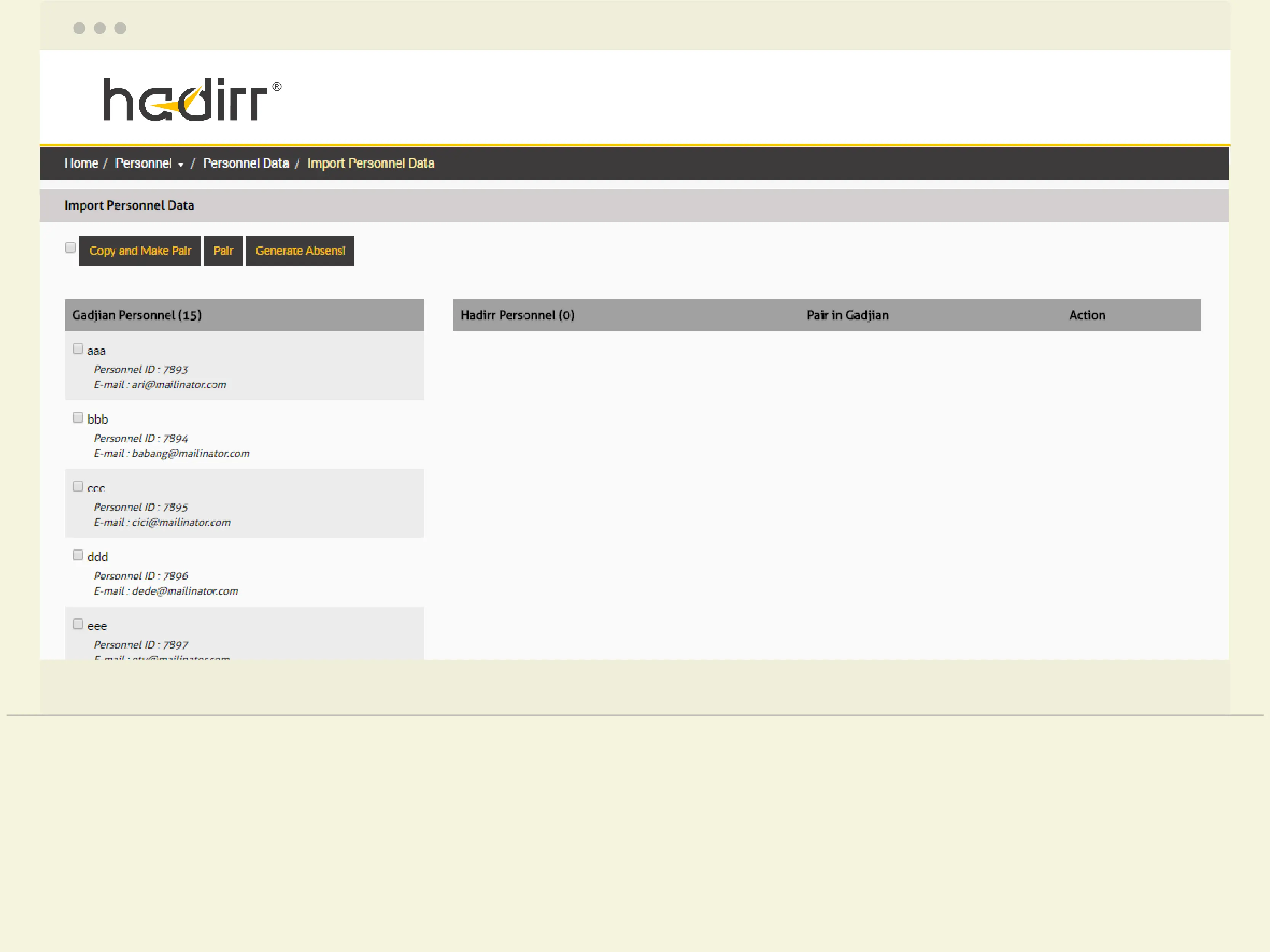 d. If the names of personnel has showed up in Hadirr's Personnel Data, it means your personnel attendance at Hadirr has already integrated into Gadjian