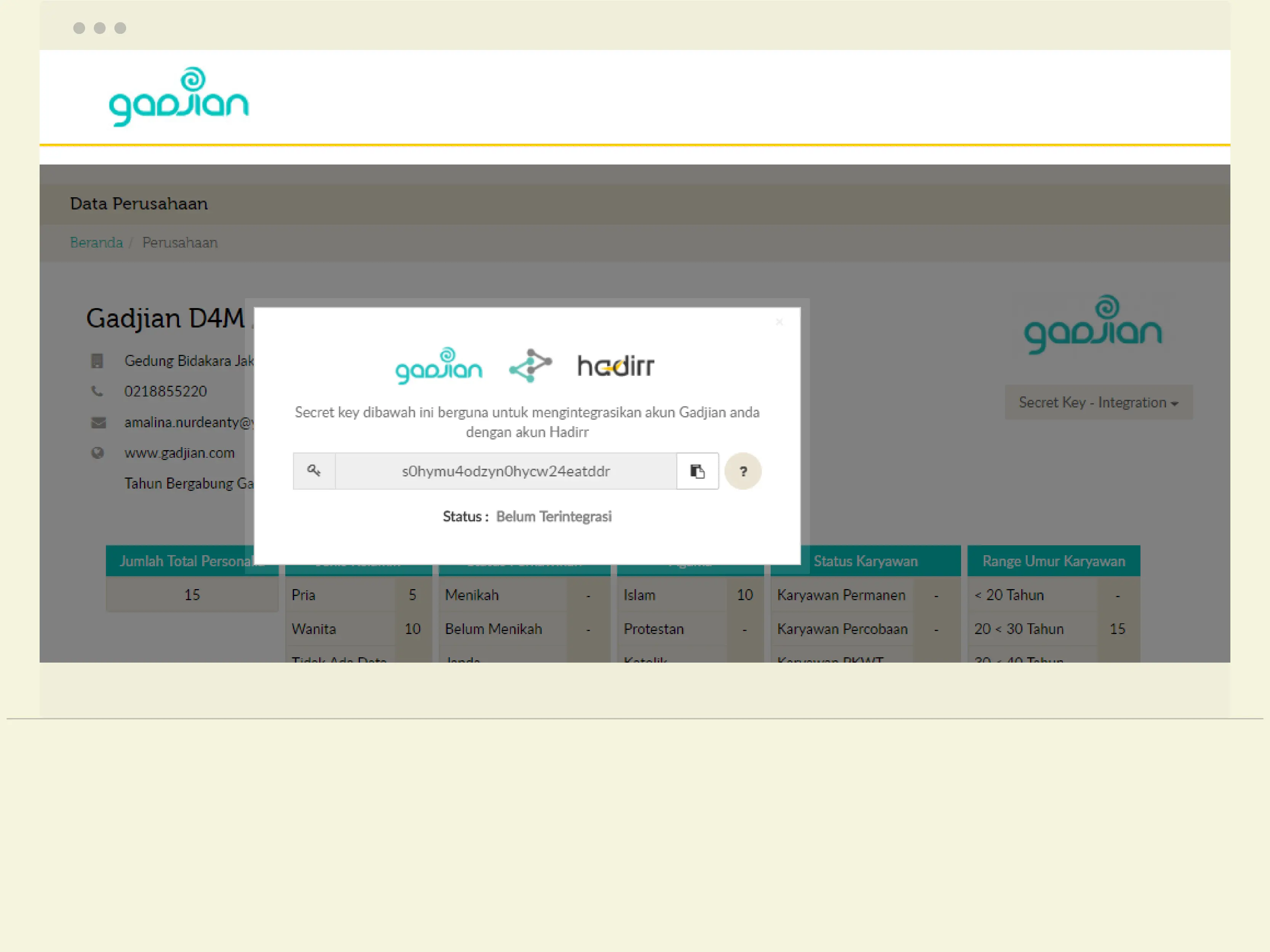 Please login to your Gadjian account, select the Company> click the Secret-Key Integration tab > select Presence and then it will appear pop-up that contains your secret-key .