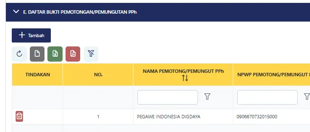 6. Selanjutnya, bukti potong PPh istri dari perusahaan otomatis akan masuk di L1 Bagian E. Daftar Bukti Pemotongan/Pemungutan PPh