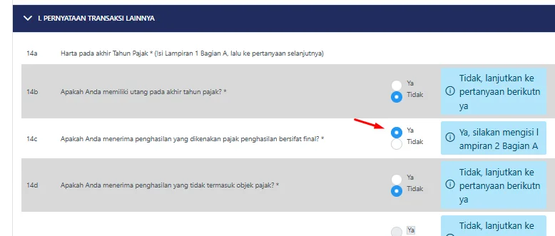 1. Di form Bagian I. Pernyataan Transaksi Lainnya, no 14c Apakah Anda menerima penghasilan yang dikenakan pajak penghasilan bersifat final? Pilih Ya.