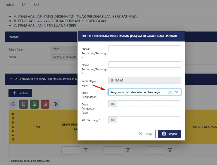 2. Lanjutkan dengan mengisi jenis penghasilan final di lampiran L2 Bagian A dengan memilih Penghasilan istri dari satu pemberi kerja, lalu klik Simpan.