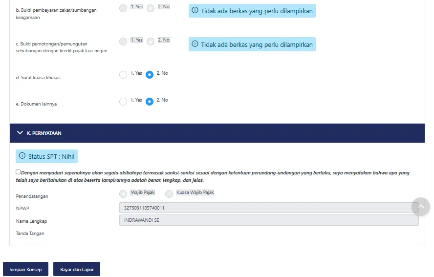 3. Di form Bagian K. Pernyataan, akan muncul Status SPT: Nihil. Lalu, klik Simpan Konsep.