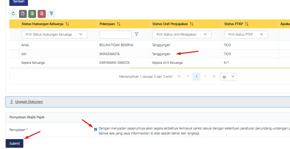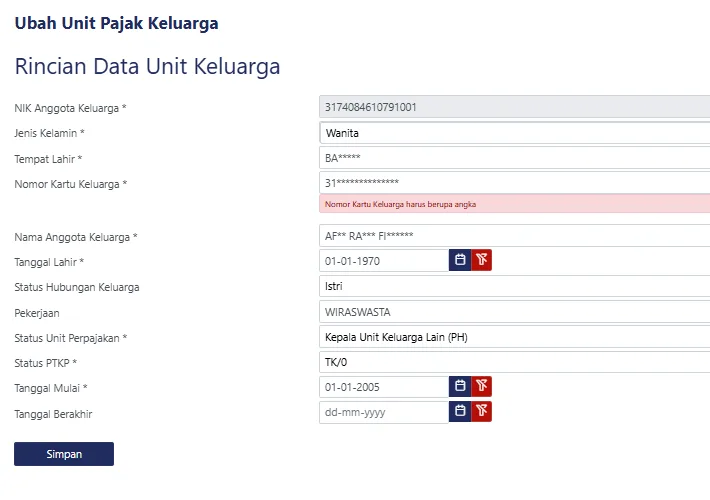 4. Pada form Rincian Data Unit Keluarga, ubah kolom Status Unit Perpajakan—yang sebelumnya Kepala Unit Keluarga Lain (PH) atau (MT)—menjadi Tanggungan, lali klik Simpan.