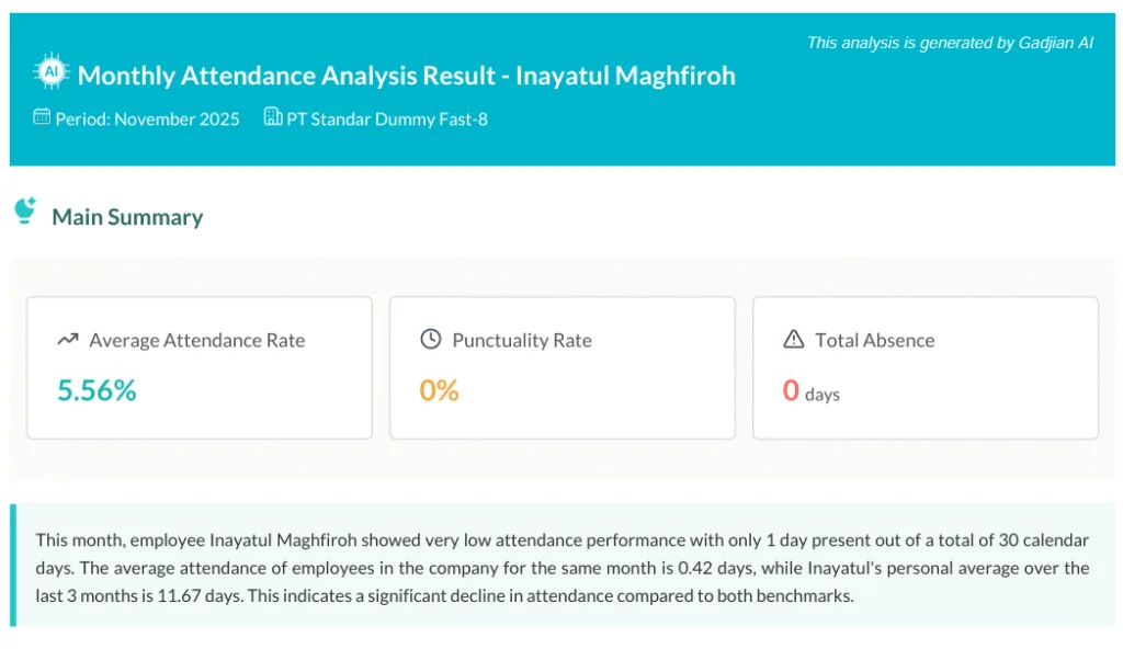 Melalui fitur HR analytics dashboard, Gadjian menyajikan data real time dalam bentuk grafik visual dan insight berbasis AI yang mudah dibaca manajemen. HR dapat melihat pola kehadiran, izin, sakit, hingga cuti, lalu mengaitkannya dengan komitmen kerja dan potensi penurunan produktivitas di unit tertentu.
