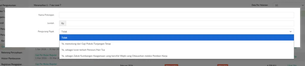 Di aplikasi Gadjian, saat membuat komponen potongan di slip gaji, terdapat opsi “Pengurang Pajak” yang dirancang sesuai ketentuan PP 58/2023 dan PMK 168/2023. Pilihannya meliputi: